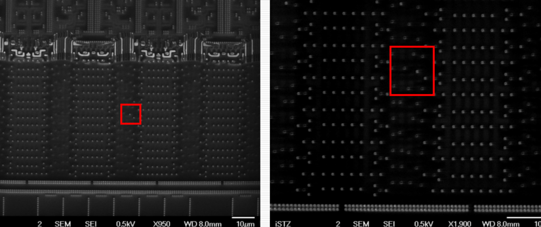 IC线路逆向分析:使用扫描式电子显微镜(SEM)大范围拍摄之影像,左图是由100张拼图而成的SEM影像,右图为取左图其中一小块的影像,可以清楚呈现纳米等级的线路。